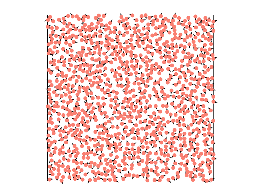 # Integrator for updating particle orientation, friction gamma = 1.0, "rotation" T = 0.1, D_r = 0.0, "random seed" seed = 10203